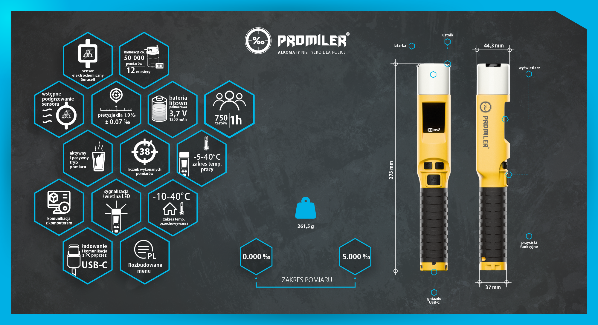 Zaprojektowany zgodnie z wymogami pracy policji,straży i innych służb mundurowych, PROMILER iBLOW 15 umożliwia błyskawiczny pomiar trzeźwości. Doskonale sprawdza się w badaniach drogowych, punktach kontrolnych czy dużych zakładach pracy - gdy liczy się szybkość, a precyzja i wiarygodność wyniku są kluczowe.